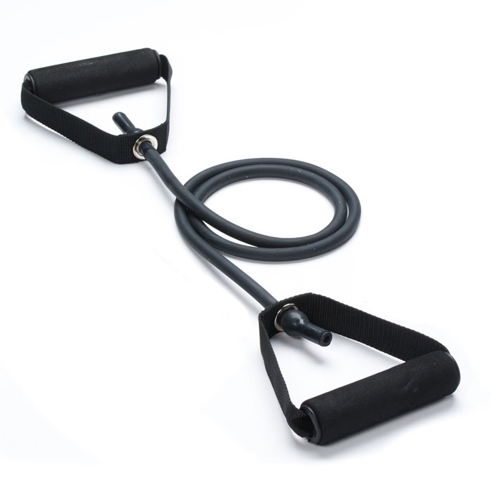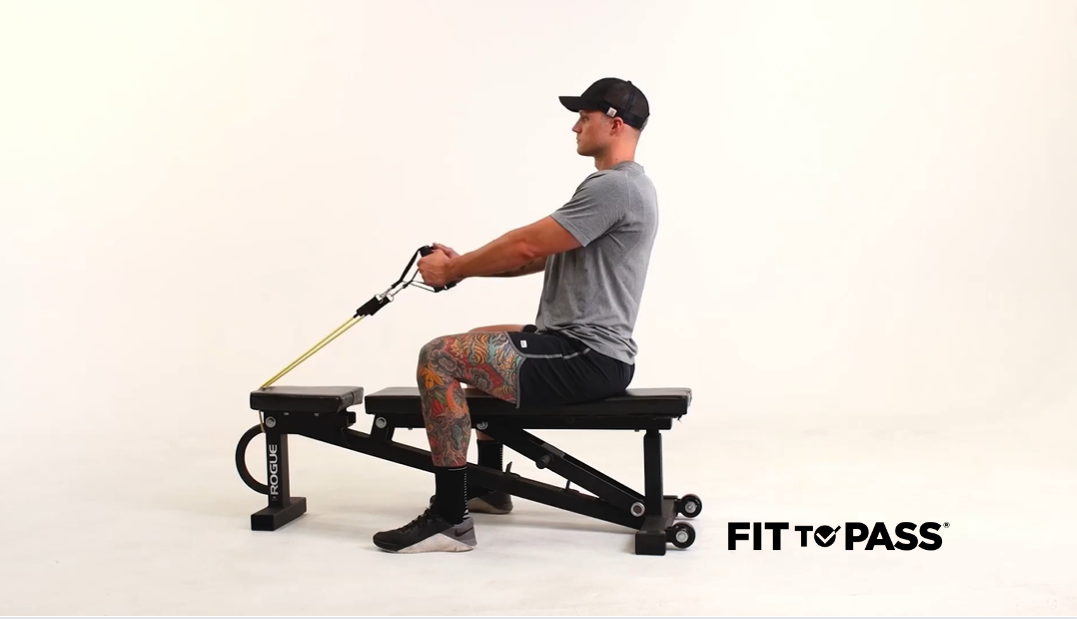 - Sit tall with abs tight and hold handles in front of you with elbows bent next to your side.